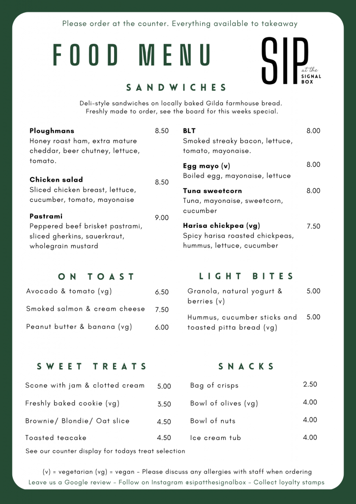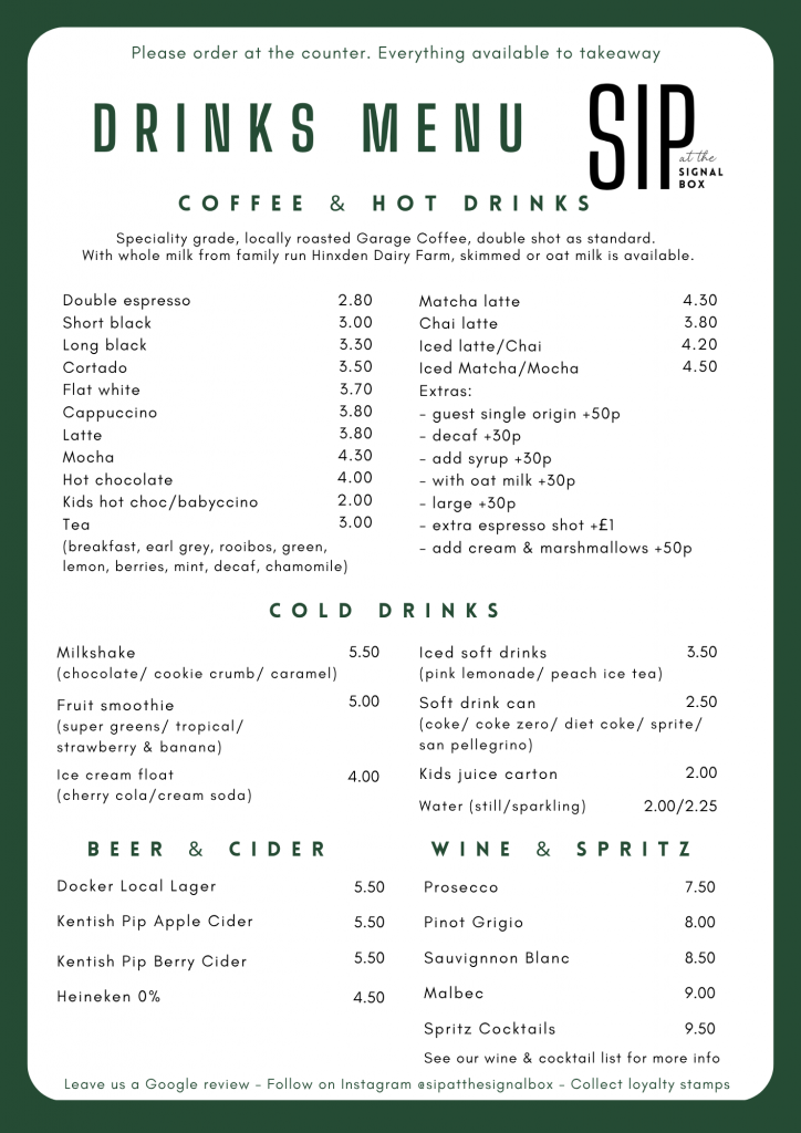 Here’s the current food and drink menu for SIP at the Signal Box at Folkestone Harbour Station. Please note things may change due to stock availability and we offer regularly changing specials, plus a full wine list and events menu.